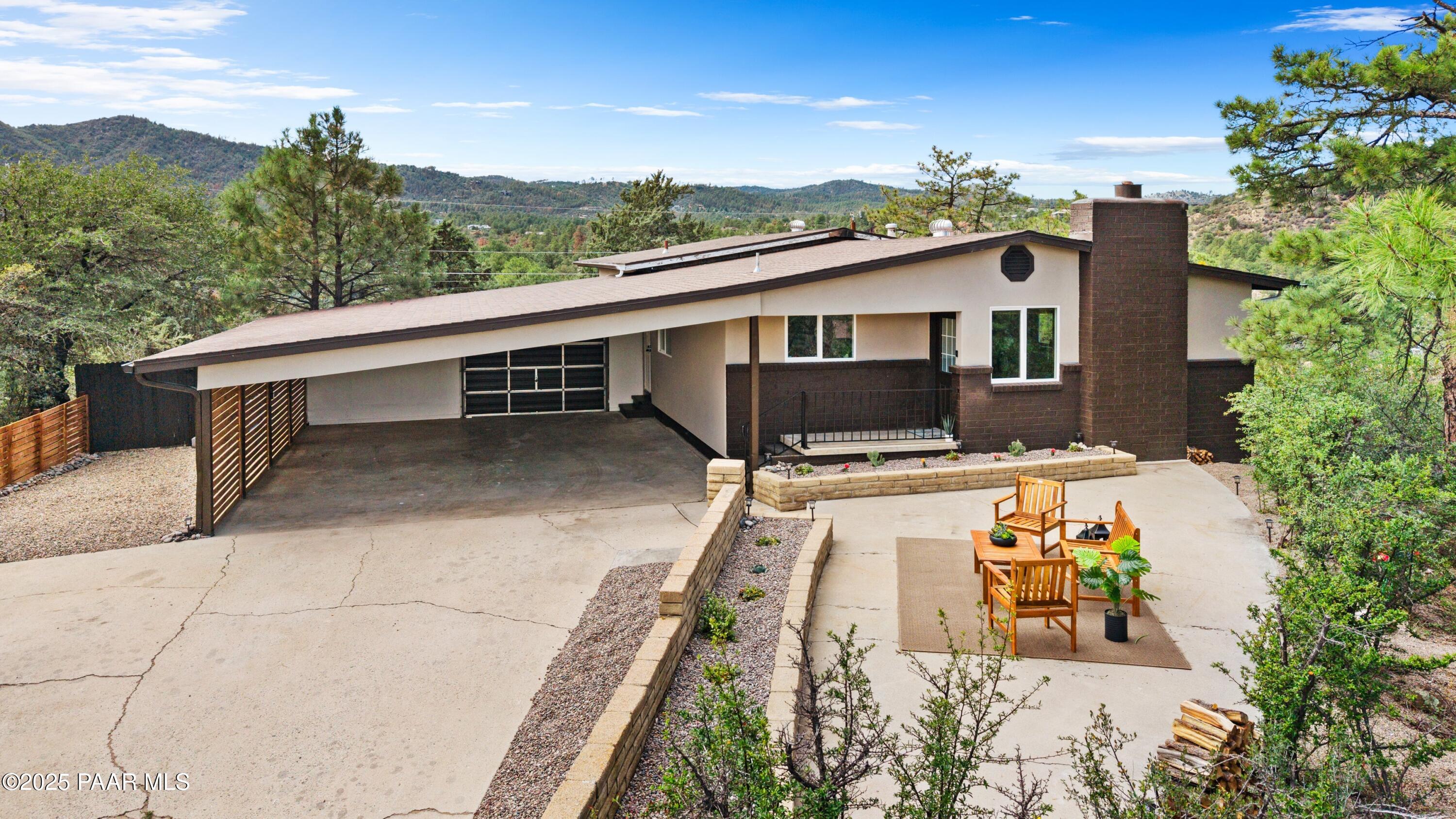 Welcome to Your Luxury Rustic Retreat in Prescott. This beautifully renovated 3-bedroom, 2.5-bath home offers just over 2,000 sq ft of refined living, blending rustic character with modern upgrades. Nestled on a generous lot just minutes from downtown Prescott, it boasts breathtaking views of Thumb Butte, the national forest, and a peek-a-boo view of Granite Mountain. Step inside and experience the perfect mix of warmth and sophistication. The newly remodeled kitchen is a true showpiece: featuring new cabinetry, food-safe stained butcher block countertops, a large island with counter-height seating, open shelving, and a stunning large-format tile backsplash. Designed with entertaining in mind, the open layout flows seamlessly into the living and dining areas, making it the heart of the home for gatherings both large and small. The reimagined primary suite is its own retreat, complete with restored hardwood floors, a cozy coffee nook framed by a large bay window overlooking the national forest, and a spa-inspired bath with a Schluter-KERDI waterproofed shower, custom-built vanities, and designer fixtures. Upstairs, the warmth of the original hardwood continues, while the rest of the home shines with new flooring, baseboards, crown molding, and craftsman-style door and window casings. For a one-of-a-kind touch, the family room downstairs features a built-in shelving unit that opens to reveal a secret whiskey and wine room perfect for relaxed evenings or impressing guests. The outdoor spaces are just as impressive, with RV parking, desert landscaping, and an expansive entertainer's deck and pergola. This spacious backyard is perfect for gatherings, al fresco dining, or quiet evenings under Prescott's clear skies. This home has been transformed from top to bottom, offering timeless rustic elegance with every modern comfort. Truly a Prescott gem you won't want to miss. Additional upgrades include Brand-new A/C system; All new double-paned windows; Fresh stucco siding and new paint; New septic tank; Updated carport, fencing, and RV parking; newer roof (approx. 2 years old)